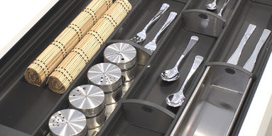 Različne izvlečne omarice, od mrežnih za steklenice, s polnim dnom, nižje in višje, z vrtečimi mehanizmi, za kruh in shrambo.